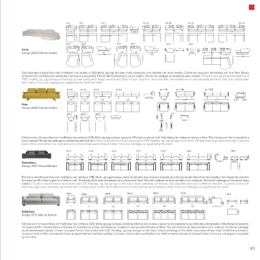 em espuma HR e face superior e inferior soft; Almofada de Costas em penas com mistura de fibra; Pés em madeira de faia/carvalho com velatura; Tecido de catálogo ou fornecido pelo