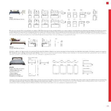 Cabeceira, Estrutura em choupo/faia e OSB; Estofo edredon de penas e fibra; Base: Estrutura em choupo/faia com malhetes nas uniões, estofo espuma de diferentes densidades; Pés