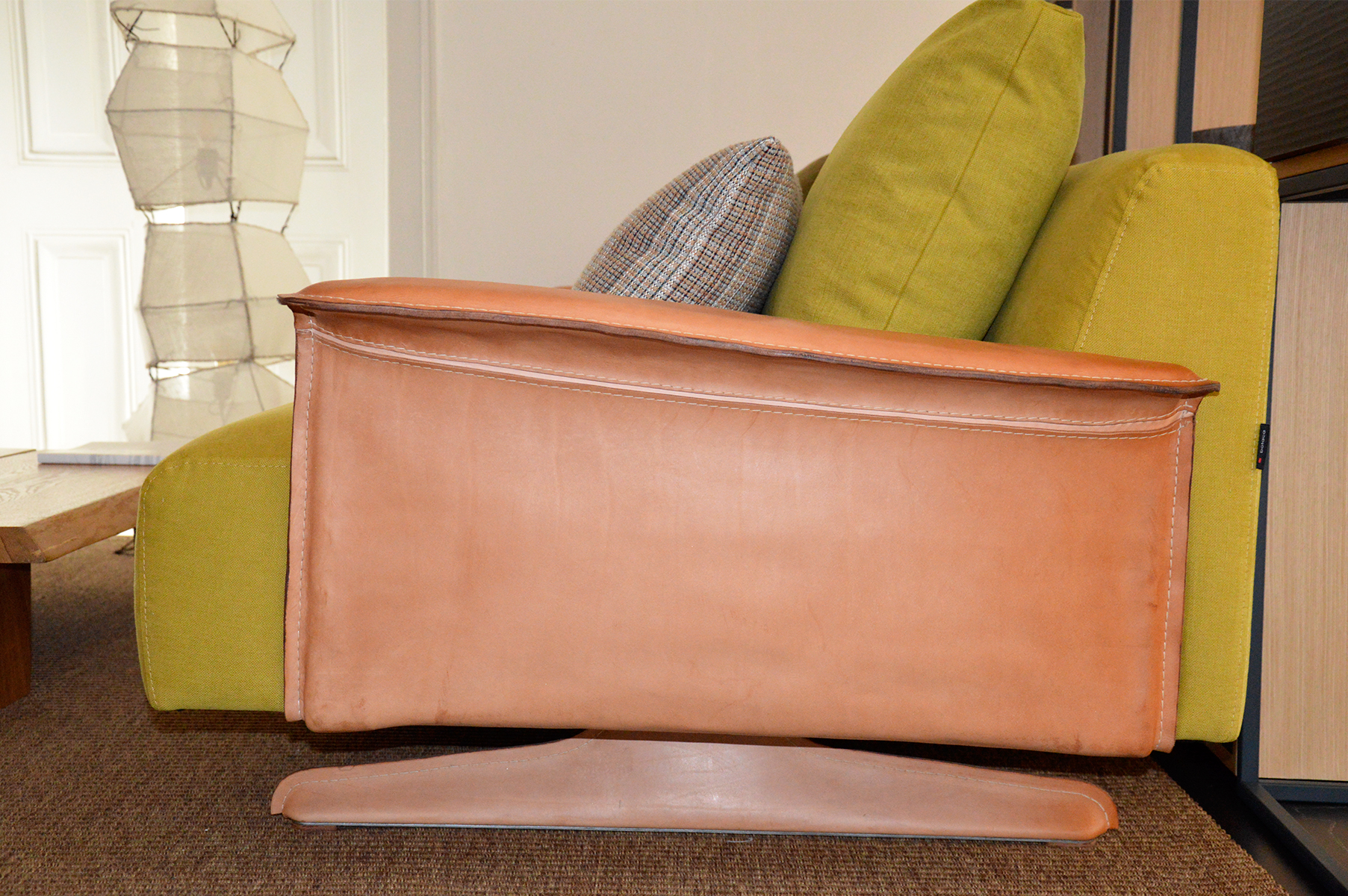 Leather upholstered iron feet and arms